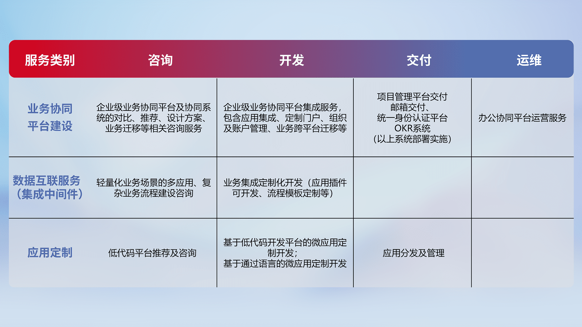 针对钉钉、、企微、、、、IDaas等平台级产品提供产品的规划、、、、方案、、交付、、、、定制化开发等服务,,实现如统一协同办公、、智能客户服务、、、混合会议管理、、智能数据查询、、、、等业务场景,,,,实现数字化转型。。