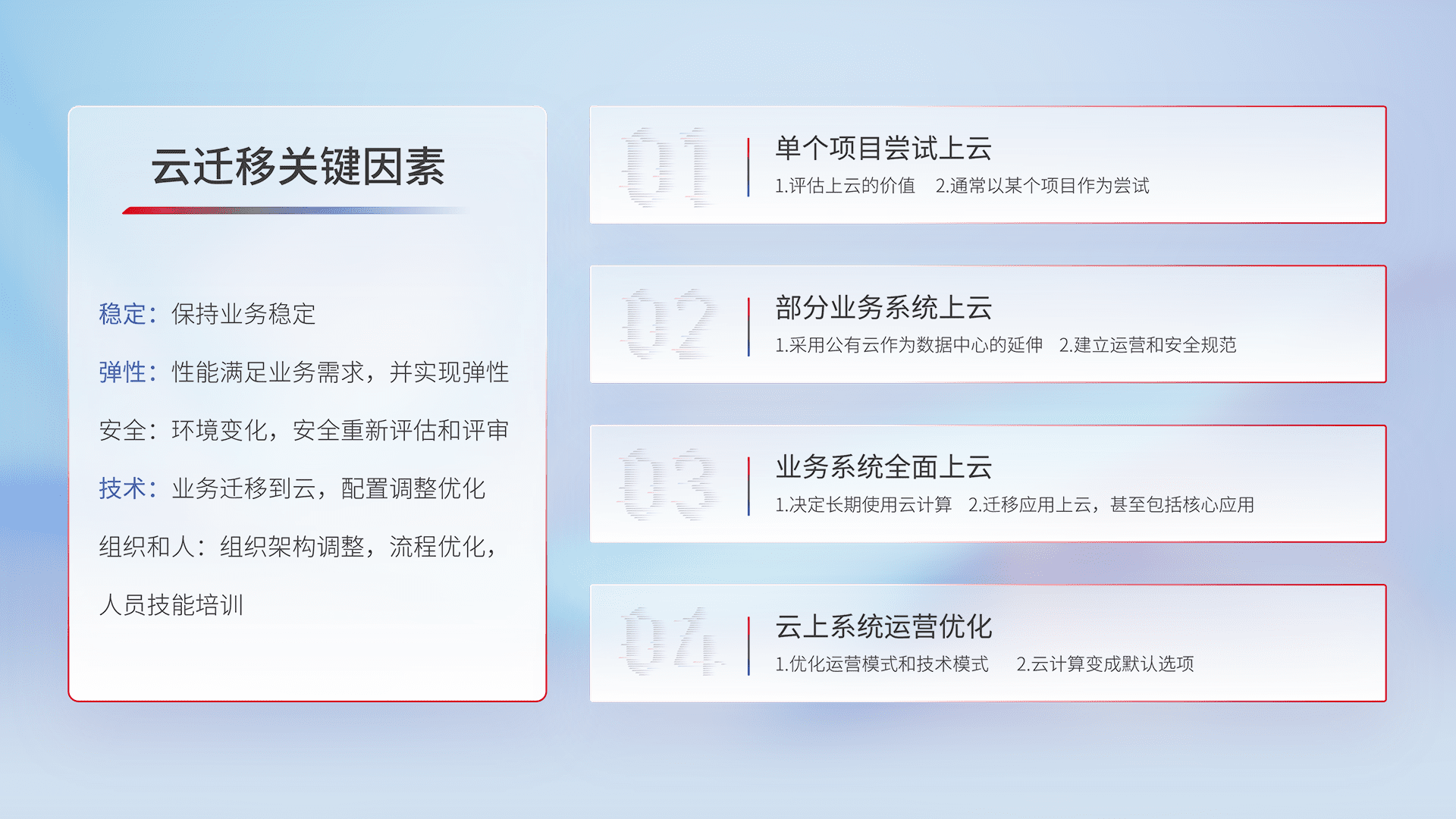 结合实际业务,,,,从规划设计、、云平台选型、、、云原生改造、、数据迁移、、、、集成交付,,,迁移全过程为客户识别最佳上云路径,,,,做好风险识别管理,,设计网络架构、、、身份权限、、、、安全审计合规、、、操作审计、、日志审计、、、监控告警策略、、、、多站点容灾设计等,,,对云上基础设施进行整体规划,,,提升IT治理水平,,以满足弹性、、、高可用、、高性能的需求。。。