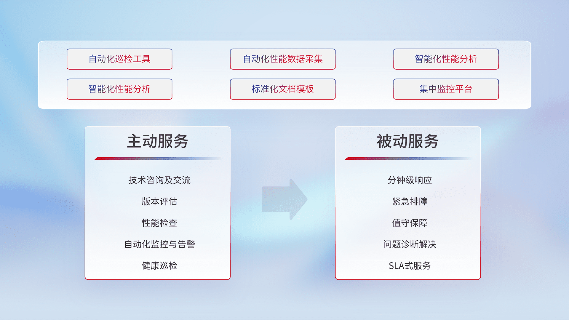 智能化工具和标准化文档,,保障服务质量,,提供主动服务(包含技术咨询、、、版本评估、、性能检查、、自动化监控与告警、、、健康巡检)和被动服务包含(分钟级响应、、、、紧急排障、、值守保障、、问题诊断解决、、SLA服务)。。。。